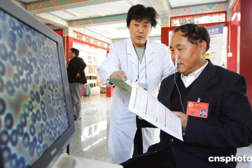 圖:醫(yī)務(wù)人員為全國(guó)政協(xié)委員做健康檢查