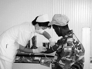 各項工作一展開,隊員們又發(fā)現(xiàn)了一項難題:語言溝通困難。盡管出征前她們都進(jìn)行過英語的突擊訓(xùn)練,但當(dāng)?shù)厝丝谥械挠⒄Z相對于標(biāo)準(zhǔn)英語來說,有如廣東話和普通話的區(qū)別。為了盡快適應(yīng)這里英語發(fā)音特點(diǎn)和習(xí)慣,女隊員們充分利用打針、護(hù)理的一切機(jī)會虛心學(xué)習(xí),將醫(yī)療隊變成了一個“非洲英語角”。