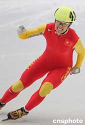 三月十二日在北京首都體育館舉行的二00五年短道速滑世界錦標(biāo)賽女子五百米比賽中,中國選手楊揚、王濛、付天余發(fā)揮出色,包攬前三名。圖為楊揚奪冠后慶祝。作者:武仲林