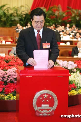 十屆全國(guó)人大三次會(huì)議三月十三日上午在北京人民大會(huì)堂舉行第四次全體大會(huì),代表們投票選舉中華人民共和國(guó)軍事委員會(huì)主席。圖為胡錦濤投票。作者:毛建軍