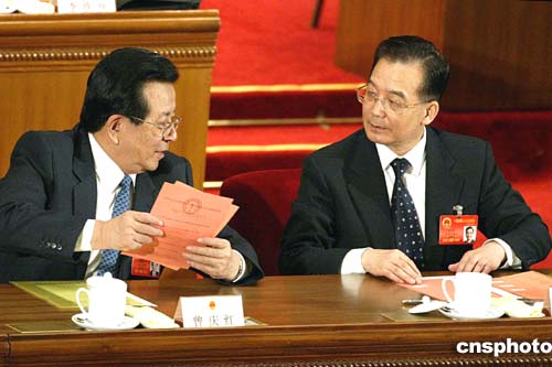 十屆全國人大三次會議第四次全體大會三月十三日在北京人民大會堂召開,胡錦濤當選為中華人民共和國中央軍事委員會主席。圖為國務院總理溫家寶和國家副主席曾慶紅領(lǐng)到選票。作者:廖文靜