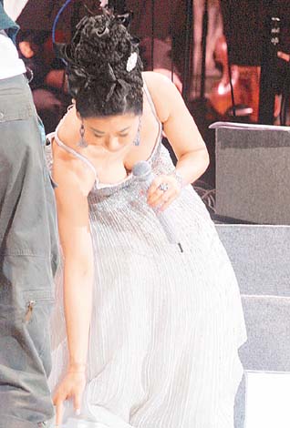 而沙麗則以高貴宮廷貴婦造型亮相,她身穿性感的白色低胸吊帶裙,披了小外套,襯以高髻發(fā)型,并佩戴閃令令的鉆石耳環(huán)及戒指,貴氣十足,但沙麗自嘲發(fā)型似菠蘿頭.之后沙麗問歌迷介不介意她脫去外套?然后指揮家便替沙麗除去外套,沙麗說:“今晚不跳舞,不會(huì)有危險(xiǎn).今晚我買了保險(xiǎn),如果像我老公一樣跌傷也會(huì)有錢賠!