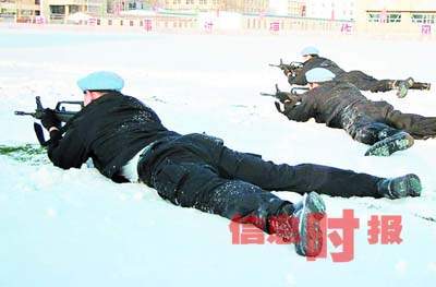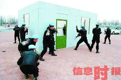 即使如此,他們?nèi)匀灰邮堋疤胤N兵”式的訓(xùn)練。翻開(kāi)厚厚的培訓(xùn)課程表,短短一周內(nèi),防暴隊(duì)員們就要學(xué)習(xí)無(wú)線電通訊、反襲擊戰(zhàn)斗、反劫持人質(zhì)、自我心理調(diào)節(jié)等多門課程,進(jìn)行戰(zhàn)術(shù)手語(yǔ)、擒敵拳、丁字棍、盾牌操、穿戴防暴盔甲服及防毒面具的訓(xùn)練等。