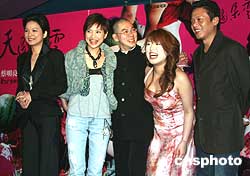 榮獲柏林電影節(jié)銀熊獎(jiǎng)的臺(tái)灣電影《天邊一朵云》在全臺(tái)公映。該片因有暴露的性愛(ài)鏡頭而引起一些爭(zhēng)議。圖為3月18日晚,臺(tái)灣著名導(dǎo)演蔡明亮(中)與該片主要演員出席在臺(tái)北舉行的首映式。作者:董會(huì)峰