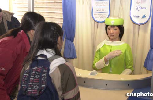 日本愛知世博會(huì)從三月十八日至二十日舉行正式開幕前的預(yù)覽會(huì),從事各種工作的各色機(jī)器人也紛紛上崗。圖為世博會(huì)入口附近的仿真式向?qū)C(jī)器人,正在向入場(chǎng)者作講解。據(jù)介紹,這款機(jī)器人可用中、日、英、韓四種語(yǔ)言同參觀者簡(jiǎn)單會(huì)話,并介紹和指點(diǎn)展示內(nèi)容等。作者:王健