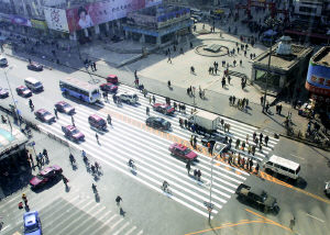 在道路東側(cè),四五輛出租車斜在路口,記者問一名司機(jī)是否在等客,他焦急地回答:“等啥客呀,我在等路!”在他身邊,走在“斑馬線廣場”上的行人更顯愜意和悠閑!巴Ψ奖愕摹!甭啡撕蚺、馬先生都表示,“多寬綽啊,反正啥車到這都得慢行了!庇浾咦⒁獾剑凇鞍唏R線廣場”的四周,沒有任何信號燈。