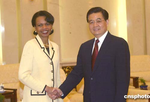 中新社北京三月二十日電(記者齊彬)中國國家主席胡錦濤今天下午在人民大會堂會見了美國國務(wù)卿賴斯。