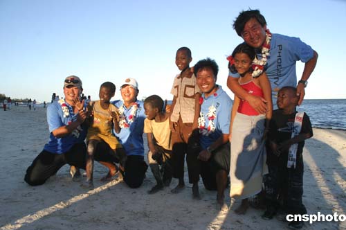 香港鳳凰衛(wèi)視“鳳凰號”單桅帆船完成鄭和下西洋航程十六日抵達(dá)肯尼亞蒙巴薩港,圖為“鳳凰號”隊員們十九日與肯尼亞兒童在一起。作者:邢健