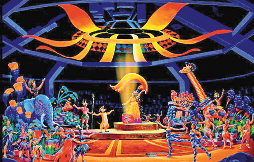 旅客亦可坐在一個容納二千二百人,以及有三百六十度觀景的劇院內(nèi)欣賞另一出歌舞劇“獅子王慶典”,八十五名演藝人員會在每天八次,每次三十分鐘的演出中,將《獅子王》的故事表演發(fā)揮得淋漓盡致。在歌舞劇中,旅客可聽到由Elton John演唱的“Can You Feel The Love Tonight?”,以及其它《獅子王》的經(jīng)典金曲。