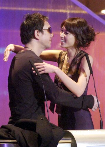 2005年度香港電影界重要獎項﹐“香港電影金像獎頒獎典禮”3月27日在香港紅磡體育館舉行。擔任頒獎嘉賓的黃秋生擁抱林志玲。作者:洪少葵