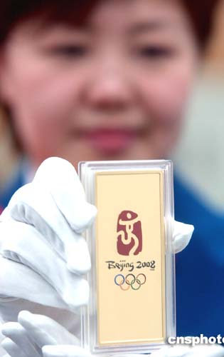 | 3月29日,“北京奧運(yùn)金”彩色系列第一組開始在北京菜百公司發(fā)售!氨本⿰W運(yùn)金”材質(zhì)為99.99%的黃金,分別為50克、100克和1000克三種規(guī)格,全國(guó)總發(fā)行量為1.75噸。據(jù)介紹,北京奧運(yùn)金彩色系列擬發(fā)5組相對(duì)獨(dú)立的產(chǎn)品,第一組紀(jì)念?yuàn)W運(yùn)會(huì)徽,其他組系的主要內(nèi)容為吉祥物,主場(chǎng)館,奧運(yùn)火炬,奧運(yùn)會(huì)開幕等。作者:韓藝冰