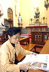 澳門(mén)一位女士在主教堂內(nèi)追思教皇,三日,當(dāng)澳門(mén)信徒得悉教皇保羅二世離世后,他們紛紛到教堂用各種形式悼念教皇。作者:梁永強(qiáng)