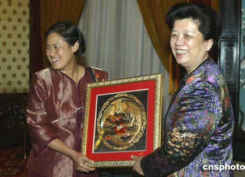 國務(wù)委員陳至立在北京向泰國公主詩琳通贈送了一幅中國K金龍鳳繡作為五十歲生日禮物。作者:廖文靜