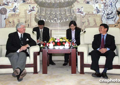 二零零五年四月六日,中國國家體育總局副局長段世杰(右)在北京會見了加拿大奧委會首席執(zhí)行官克里斯·盧杰(左)一行,并出席中加兩國奧委會簽署的諒解備忘錄。作者:武仲林