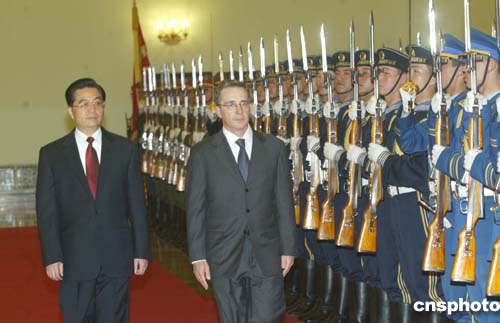 四月六日,中國國家主席胡錦濤在北京人民大會堂主持儀式,歡迎哥倫比亞總統(tǒng)烏里韋來華訪問。作者:史利