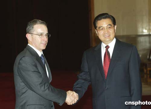 圖:胡錦濤會見哥倫比亞總統(tǒng)烏里韋