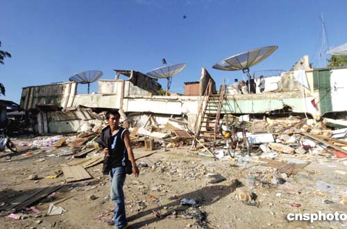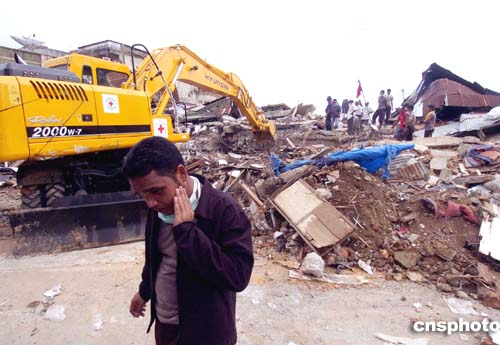 印度尼西亞蘇門答臘島海域發(fā)生大地震后,城里到處是一堆堆的廢墟,由于島上缺少挖土機(jī)、推土機(jī)等重型機(jī)械和電鉆、電鋸等設(shè)備,面對小山似的廢墟,人們赤手空拳,無能為力。作者:洪少葵