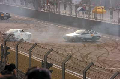 幾萬名觀眾觀看了《頭文字D》電影中的飄移比賽,在電影中使用的四輛賽車AE86、EVO、FC、GTR專門從香港運(yùn)送過來,四輛賽車在跑道中呼嘯著做各種轉(zhuǎn)彎和飄移的動(dòng)作,隨著一道道青煙的升起,全場立即沸騰起來。