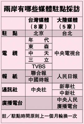 兩岸開放媒體記者采訪,大陸方面先于臺灣。1996年12月,國臺辦公布“關于臺灣記者來祖國大陸采訪的規(guī)定”,正式開放臺灣媒體到大陸采訪,目前有8家臺灣媒體派記者原則以1個月一輪方式,定期到北京采訪。