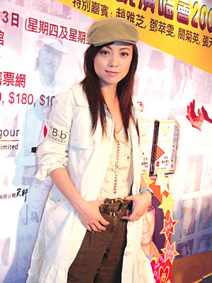 至于唱歌、跳舞及演戲,她覺(jué)得自己哪一方面最難控制?她不諱言是跳舞,因?yàn)樘柚嘤忠櫻輵蚣捌翗樱运岩蠓b設(shè)計(jì)以安全為主,因?yàn)榧t館四方八面都是觀眾。問(wèn)到安全之余會(huì)否是低胸?她笑道:“低胸也沒(méi)有驚喜啦!總之我的宗旨是視覺(jué)上可觀但又絕對(duì)安全!彼终f(shuō)四位嘉賓中,以她最貪玩,所以如果大家要看她奔放,就不要太少布。