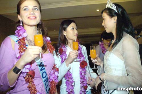 由鳳凰衛(wèi)視組織的“鳳凰有約——情系印度尼西亞送愛心”赴印度尼西亞親善訪問團,4月17至20日在印度尼西亞展開災(zāi)區(qū)親善探訪活動。圖為2004年世界小姐Miss Maria Garcia Mantilla (左)、2004年中華小姐李詩琪(中)與印度尼西亞小姐一起為災(zāi)區(qū)送愛心。作者:洪少葵