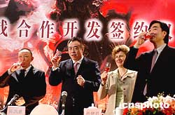 四月十八日,電影版網(wǎng)絡游戲《無極》在北京舉辦了新聞發(fā)布會.由派格無極數(shù)字文化環(huán)球傳媒公司與法國軟件開發(fā)商育碧公司聯(lián)手開發(fā),以中國電影導演陳凱歌的作品《無極》為主題的網(wǎng)絡游戲,將正式在國內開發(fā)該款游戲產(chǎn)品.據(jù)悉,這是中國電影界首次開發(fā)電影網(wǎng)絡游戲。圖為陳凱歌(左二)與主辦方開香檳慶祝。作者:韓藝冰