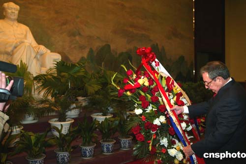 圖:勞爾·卡斯特羅向毛澤東雕像敬獻花籃