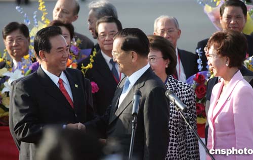 中共中央臺辦主任陳云林、中共江蘇省委副書記任彥申、中臺辦副主任李炳才與當(dāng)?shù)囟辔还賳T趨前到舷梯前迎接。