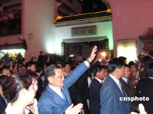 4月27日,中國(guó)國(guó)民黨主席連戰(zhàn)夫婦在夫子廟狀元樓酒店品嘗泰淮小吃晚宴后,攜夫人連方瑀女士輕松夜游秦淮河。晚8時(shí)許,連戰(zhàn)主席餐后步行走出狀元樓酒店,在夫子廟流連的燈光中,沿街兩旁的市民擊掌慶賀,連戰(zhàn)微笑著向行人致意。整個(gè)游覽過(guò)程大約在半小時(shí)左右。作者:水從澤