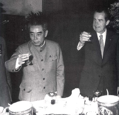 汽車到達(dá)體育館,敏感的日本記者發(fā)現(xiàn)兩人站在一起愉快地聊著,用照相機(jī)攝下了這個(gè)鏡頭。第二天,日本三大報(bào)《朝日新聞》、《每日新聞》、《讀賣(mài)新聞》的頭版顯著位置,圖文并茂地刊載了兩人握手、交談的圖片,有的還加了橫欄標(biāo)題:中美接近。