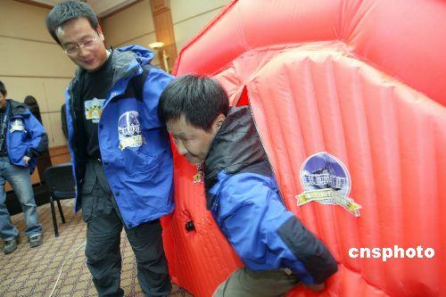 四月二十一日,由北京三夫戶外運(yùn)動(dòng)俱樂部發(fā)起并成立、聯(lián)想集團(tuán)公司冠名贊助的一支民間科學(xué)考察隊(duì)伍-聯(lián)想鋒行科學(xué)考察探險(xiǎn)隊(duì)在北京正式成立,將于今年五月份對(duì)可可西里(藏北、新疆阿爾金山區(qū)域)進(jìn)行由南至北的穿越式科學(xué)考察活動(dòng),最重要的科考內(nèi)容是與北京大學(xué)環(huán)境學(xué)院聯(lián)合進(jìn)行的“青藏高原可可西里地區(qū)表土POPs分布調(diào)查”項(xiàng)目,這項(xiàng)科考內(nèi)容在中國(guó)還是第一次。本次科考探險(xiǎn)活動(dòng)將從五月一日開始,歷時(shí)二十二天,行程六千多公里,其中穿越無(wú)人區(qū)達(dá)一千六百多公里。圖為科考探險(xiǎn)隊(duì)隊(duì)員演示一個(gè)酷似帳篷的便攜式高壓氧艙。作者:盛佳鵬