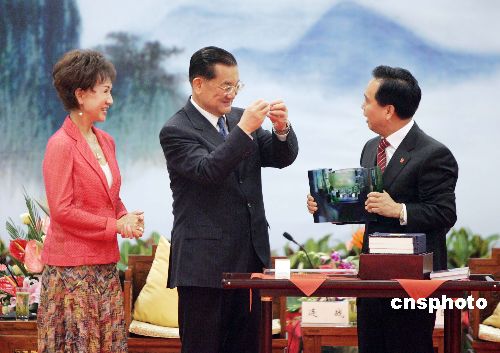 中共陜西省委書記李建國(guó)四月三十日晚在西安會(huì)見并宴請(qǐng)中國(guó)國(guó)民黨主席連戰(zhàn)和他率領(lǐng)的大陸訪問團(tuán)成員。圖為連戰(zhàn)向李建國(guó)回贈(zèng)禮物。作者:毛建軍