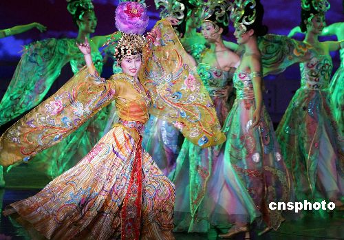 中國國民黨主席連戰(zhàn)和他率領(lǐng)的國民黨大陸訪問團成員,四月三十日晚在西安“大唐芙蓉園”觀看大型詩樂舞劇《夢回大唐》,并與演員們合影。作者:毛建軍