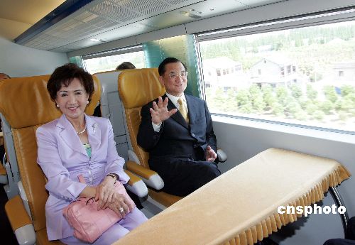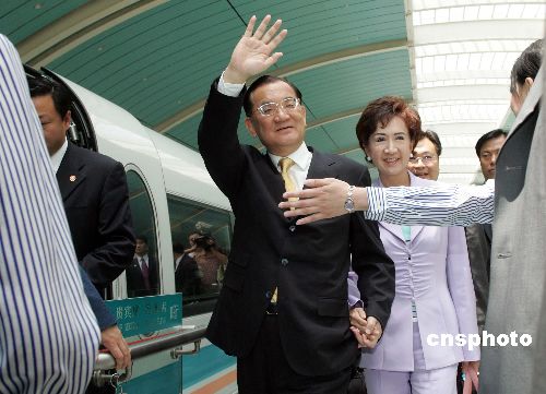 圖:連戰(zhàn)夫婦上海乘坐磁懸浮列車