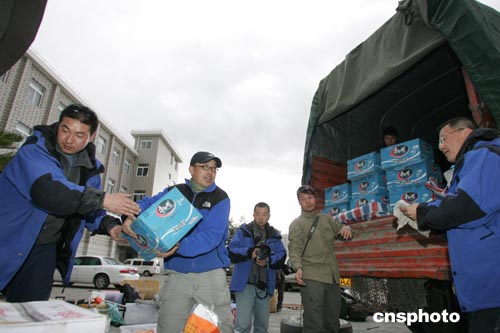 中新網(wǎng)5月8日電 二零零五年五月五日,穿越可可西里聯(lián)想鋒行探險隊車隊抵達拉薩,進行休整,為挺進可可西里作最后的準備。下圖為隊員把水、蔬菜、食物等各種宿營裝備裝入八噸重的大卡車。