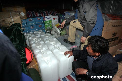 二零零五年五月五日,穿越可可西里聯(lián)想鋒行探險隊車隊抵達拉薩,進行休整,為挺進可可西里作最后的準備。下圖為隊員把大桶盛裝飲用水入車裝入八噸重的大卡車。