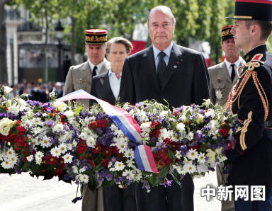 圖:法國總統(tǒng)希拉克向無名烈士墓敬獻花圈
