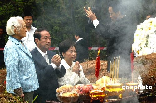 十時(shí)三十分許,按照故鄉(xiāng)世代相襲的習(xí)俗,祭拜由地方主祭人主持,宋楚瑜在曾祖父墓前鞠躬、上香、敬酒、獻(xiàn)果、叩拜、獻(xiàn)花圈。宋楚瑜代表多年前遠(yuǎn)離故土的宋家人誦讀著祭文:赫赫先靈,衍脈隆興,三湘延慶,禹宇昌榮……沒有祭樂,空靈的山頭在聆聽著這位游子對(duì)故土、故人的幾許深情。字字句句,情真意切。此情此景讓已是鶴顏白發(fā)的宋母和“湘潭媳婦”夫人陳萬水潸然淚下,情不能已。