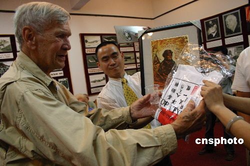飛虎隊展覽館工作人員向愛德華·康姆亞蒂(左)贈送陳納德將軍畫像和二戰(zhàn)期間美國飛行員必備的印有“來華助戰(zhàn)洋人(美國)軍民一體救護”的“救命服”