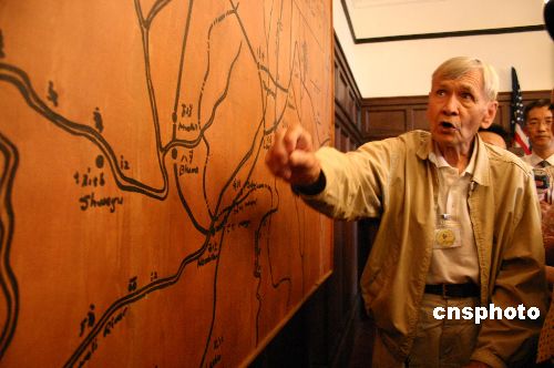 史迪威將軍舊居內(nèi),愛德華·康姆亞蒂在墻邊懸掛的巨幅中緬邊境地區(qū)地圖前講速過去那段烽火歲月
