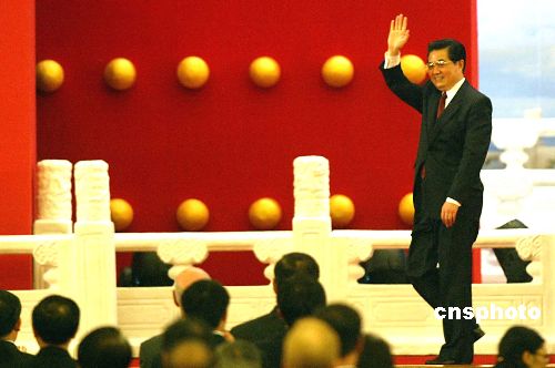 五月十六日晚,二○○五北京《財富》全球論壇在北京人民大會堂開幕,中國國家主席胡錦濤出席開幕式并作主題演講。作者:廖文靜
