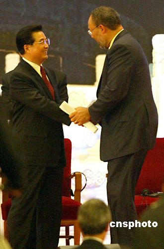 五月十六日晚,二○○五北京《財(cái)富》全球論壇在北京人民大會堂開幕,中國國家主席胡錦濤出席開幕式并作主題演講。圖為胡錦濤在演講結(jié)束后與大會主持人、時(shí)代華納公司董事長理查德·帕森里握手致意。作者:廖文靜
