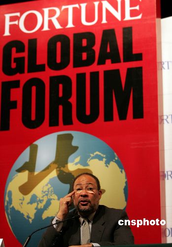 2005北京《財富》全球論壇5月17日在北京釣魚臺國賓館舉行,時代華納公司董事長兼首席執(zhí)行官理查德.帕森思(Richard D.Parsons)在會間的新聞發(fā)布會上解釋為什么《財富》全球論壇多次在中國召開的原因,并展望中國經濟的發(fā)展前景。作者:任晨鳴