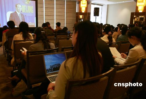 2005北京《財(cái)富》全球論壇5月17日在北京釣魚臺國賓館舉行,國務(wù)院副總理曾培炎出席首次會議并發(fā)表演講。因?yàn)榻^大多數(shù)記者不能進(jìn)入會場,只有在新聞發(fā)布廳觀看電視轉(zhuǎn)播。作者:任晨鳴