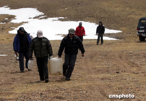隊員野外取水并將大桶飲用水運送上車(圖)