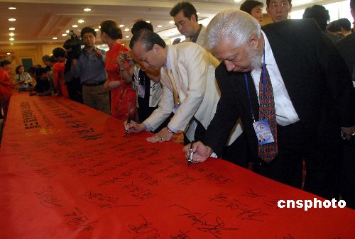 由國(guó)務(wù)院僑務(wù)辦公室和中國(guó)海外交流協(xié)會(huì)主辦的“第三屆世界華僑華人社團(tuán)聯(lián)誼大會(huì)”五月十九日在北京開(kāi)幕,圖為與會(huì)代表在“增進(jìn)共識(shí)凝聚力量反對(duì)臺(tái)獨(dú)促進(jìn)統(tǒng)一”橫幅上簽名。作者:張勤