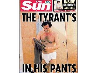 在巴格達(dá)的咖啡店,伊拉克人正在觀看一些阿拉伯衛(wèi)星電視臺(tái)播放《太陽報(bào)》頭版刊登的照片,其中一張就是薩達(dá)姆只穿內(nèi)褲站著的照片!短枅(bào)》還刊登著薩達(dá)姆在洗衣服、睡覺以及在獄中踱步等鏡頭。