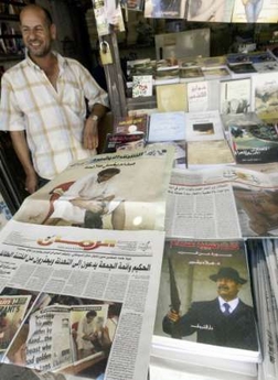 20日出版的英國(guó)《太陽報(bào)》曝光了幾張伊拉克前總統(tǒng)薩達(dá)姆·侯賽因在關(guān)押期間的照片。圖為伊拉克街頭報(bào)亭正出售刊有薩達(dá)姆獄中照的報(bào)紙。(春風(fēng))