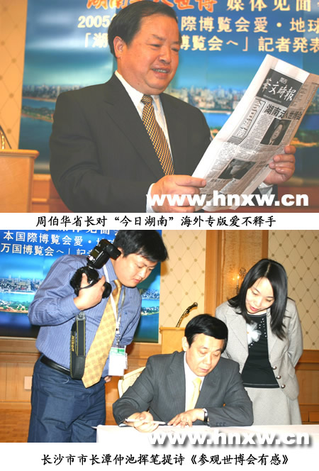 長(zhǎng)沙市市長(zhǎng)譚仲池看了“今日湖南”海外專(zhuān)版后,興奮地在記者招待會(huì)現(xiàn)場(chǎng)揮筆題詞“今日長(zhǎng)沙”,他希望中國(guó)新聞社湖南分社與日本《關(guān)西華文時(shí)報(bào)》今后能夠在日本加強(qiáng)宣傳長(zhǎng)沙,同時(shí)揮筆寫(xiě)了一首“參觀世博會(huì)有感”的詩(shī):“愛(ài)知世博花繽紛,自然人類(lèi)共文明;滿(mǎn)月?tīng)N爛話(huà)未來(lái),和平發(fā)展有智慧!