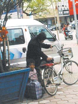 一邊等待,這個(gè)“乞兒”一邊將自己的要錢罐、滑輪車放進(jìn)了一個(gè)編織袋內(nèi)。沒了滑輪車,他怎么走?就在記者疑惑時(shí),中午給“乞兒”送肉包子的那個(gè)男子騎著一輛自行車來了?吹健捌騼骸边f上的大把錢幣,他滿意地向“乞兒”點(diǎn)點(diǎn)頭,然后將“乞兒”抱上自行車后貨架,離開了。